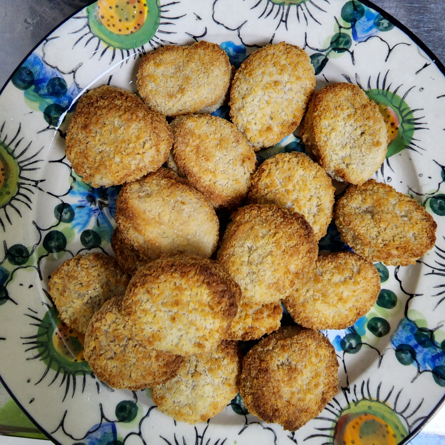 학창시절에 급식으로 나오던 미니 돈가스인데 그때는 4개밖에 못 먹었었는데 이제는 18개를 구워서 먹을 수 있습니다. 이렇게 가격이 저렴한데 그때는 너무 조금 주는 것 같아요. 아무리 생각해도 업체에서 돈을 정말 많이 남겼을 것 같아요. 어제 먹다 남은 군만두도 하나 같이 구워주었어요.