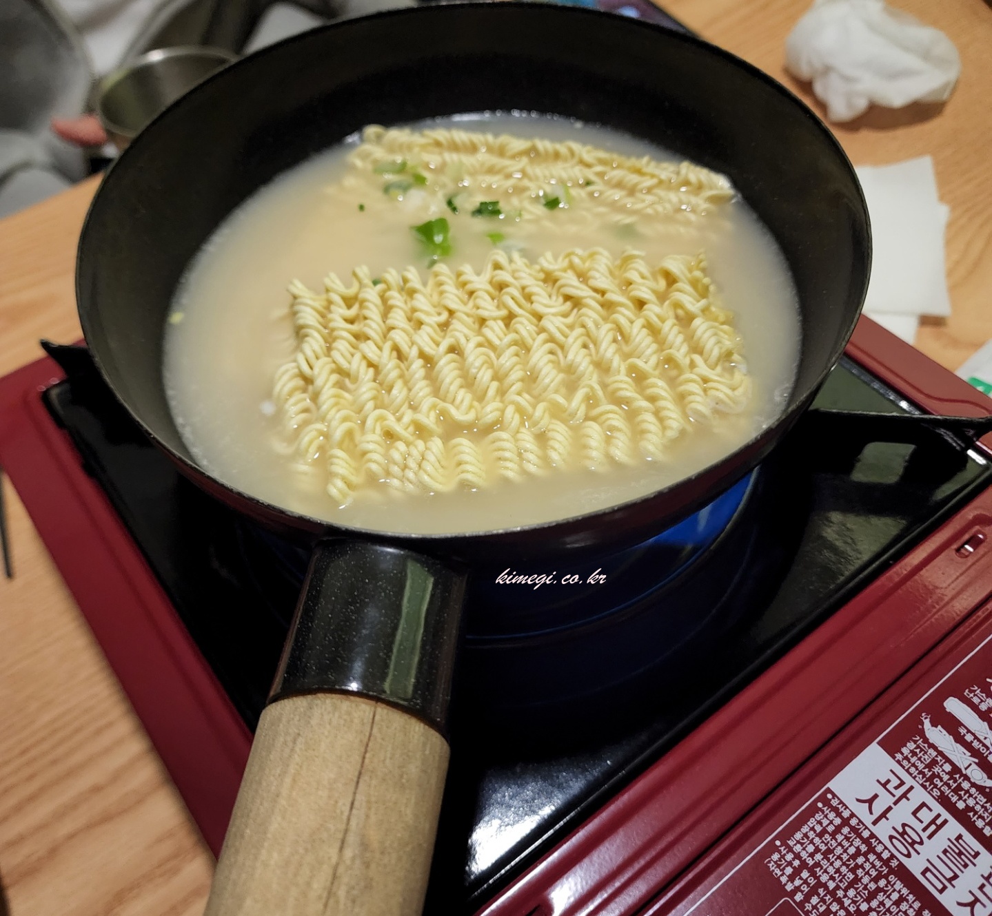 일단 먼저 사골 라면을 먼저 줍니다. 사골곰탕 라면이에요. 밑반찬은 조미 안된 김과 옥수수, 무쌈이 나와요. 삼겹살 김치볶음과 아주 잘 어울리는 밑반찬 들입니다.