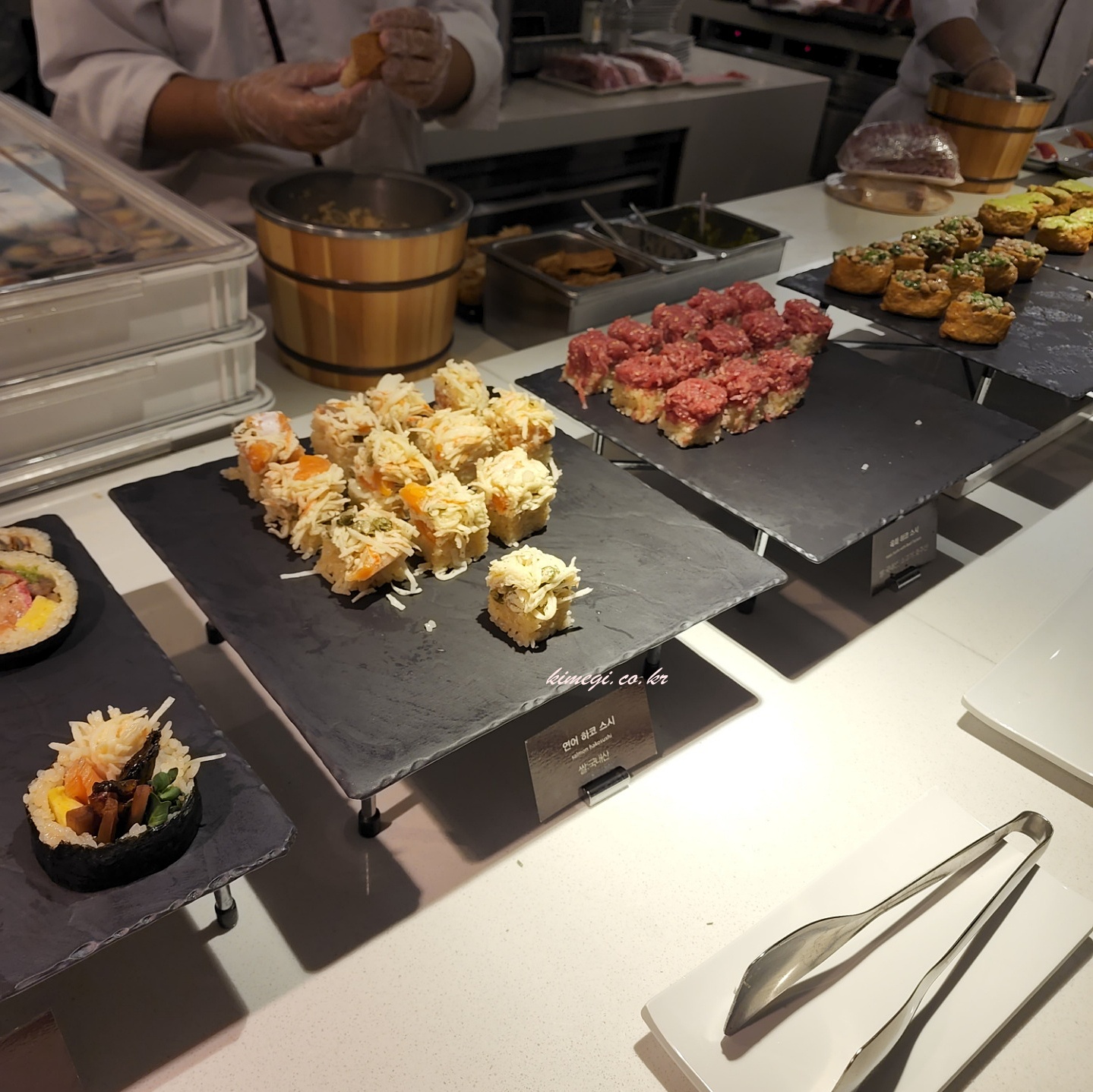 육회, 유부초밥, 연어, 김말이 등 다양한 초밥도 있었습니다. 다 너무 맛있었어요. 하나씩 먹으니까 배가 부를 정도로 종류가 많더라고요.