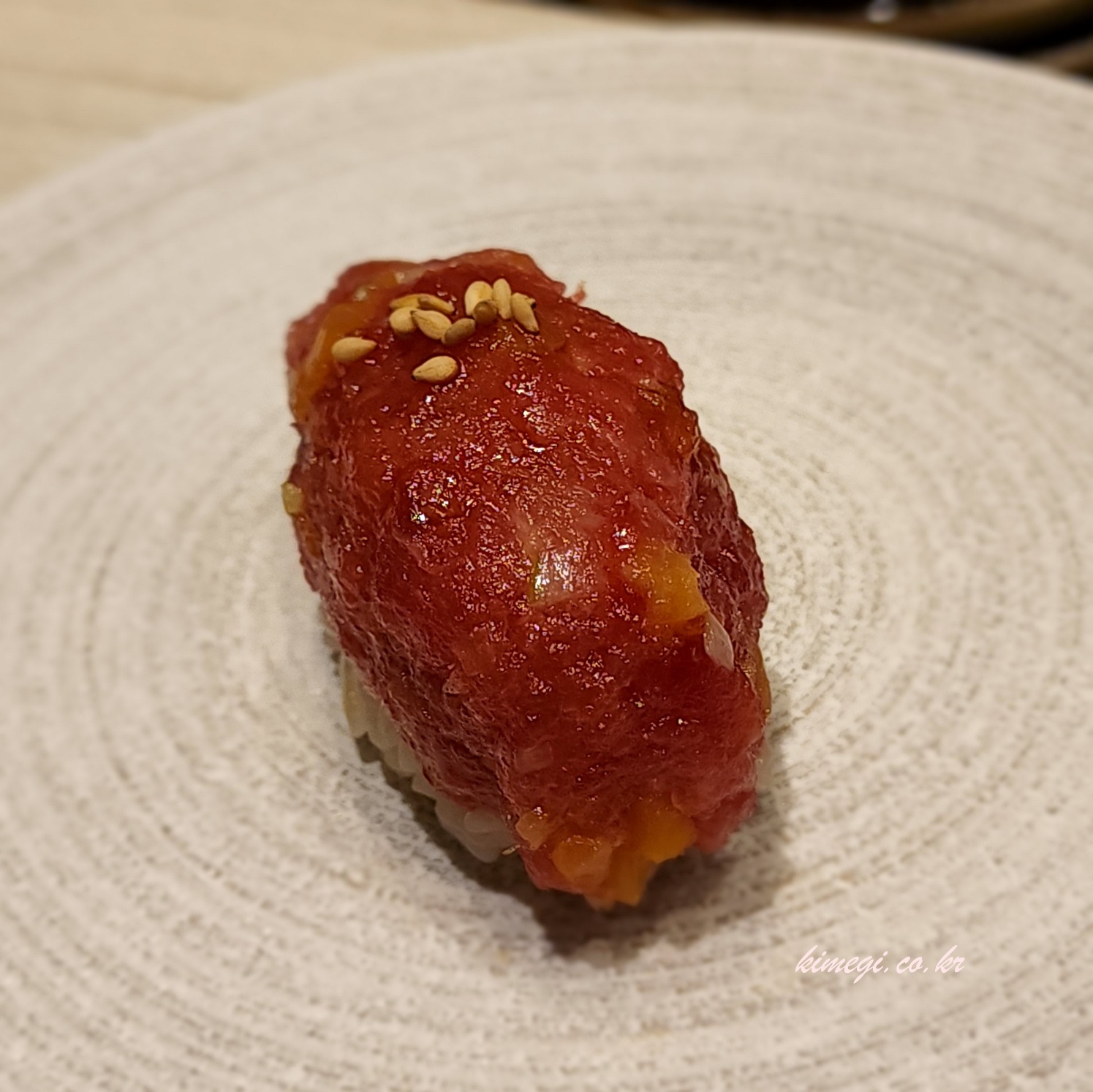 일곱 번째는 간장에 절인 참치 등살이었어요. 기름기가 적은 등살이라서 방어를 먹고 난 다음이라 조금 부족한 느낌이었어요. 저는 기름기가 많은 생선을 좋아해서 그런 것 같아요.