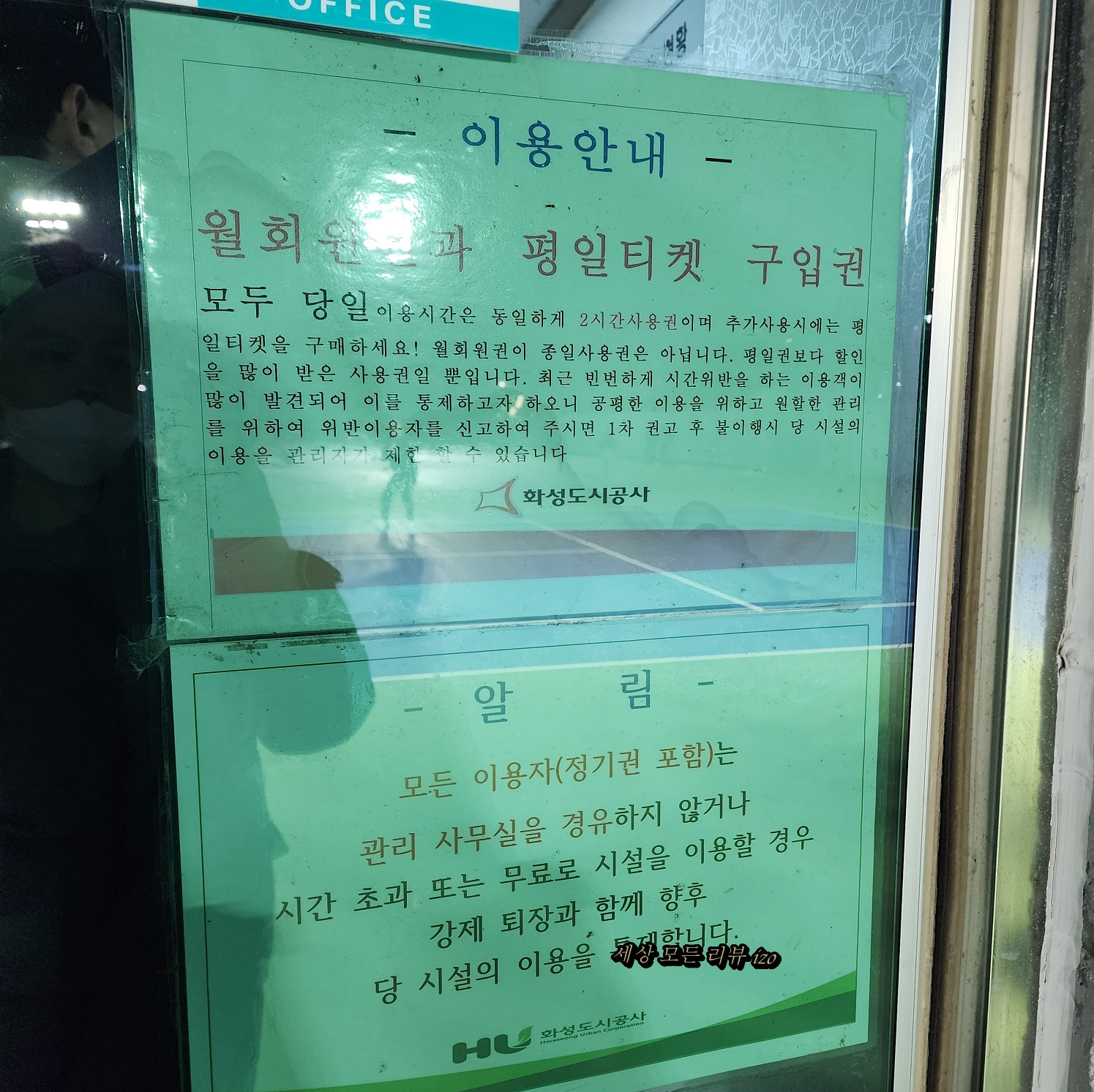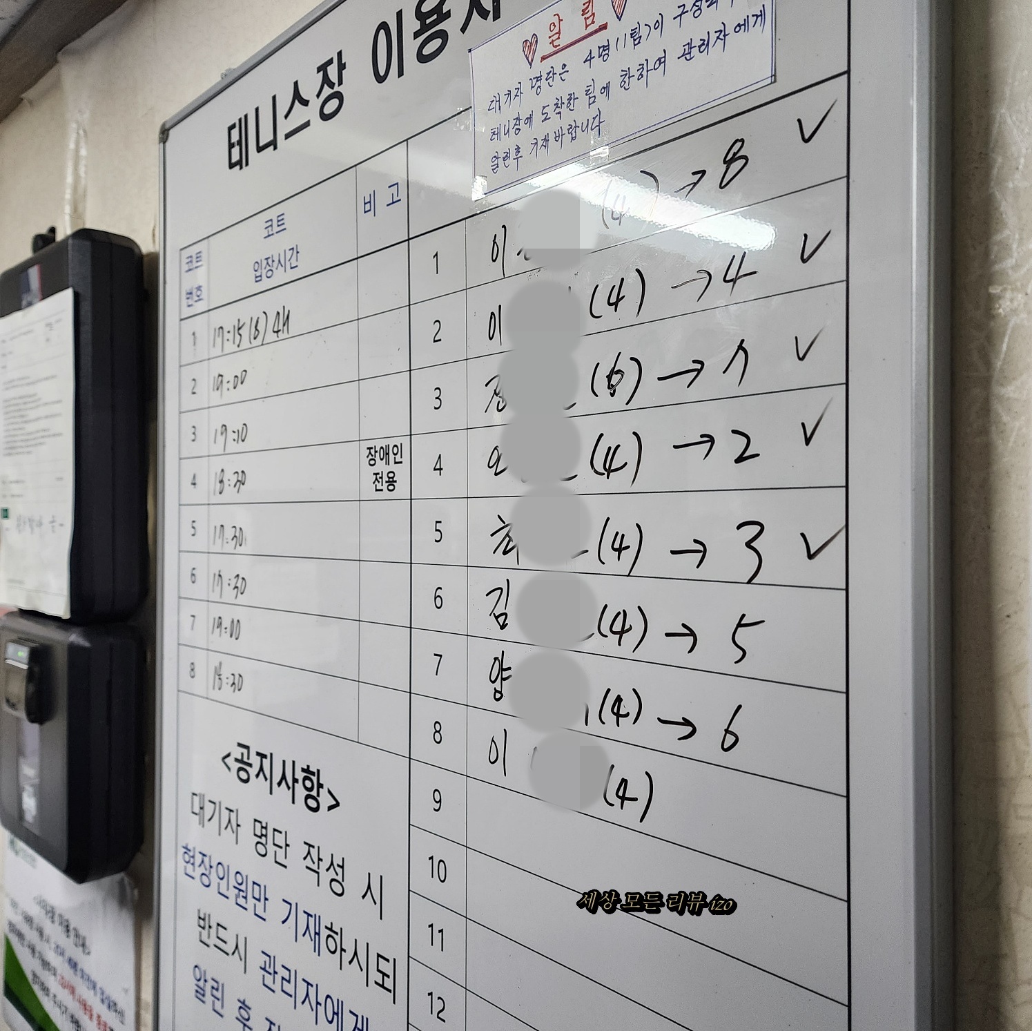 코트 옆에서 기다리다보면 전에 이용하던 사람이 시간이 되고 나오면 이용하면 됩니다. 예약 과정이 정말 간편하고 공평해서 좋습니다.