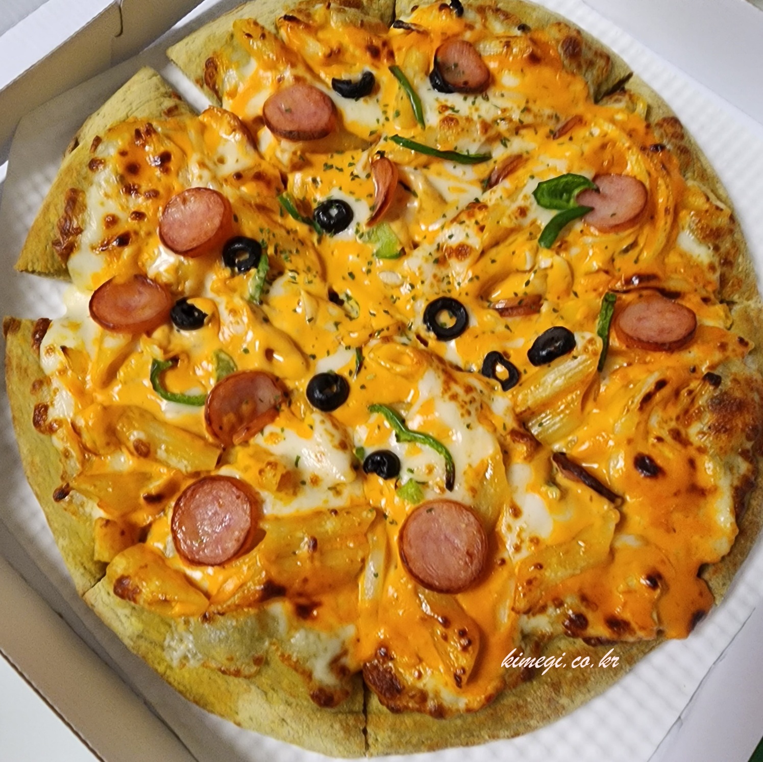 투움바파스타 피자는 투움바 소스에 팬네면이 올라가 있고 치즈가 듬뿍 올라가 있어요. 투움바 파스타 피자가 정말 궁금했는데 진짜 느끼해 보여서 기대가 돼요.