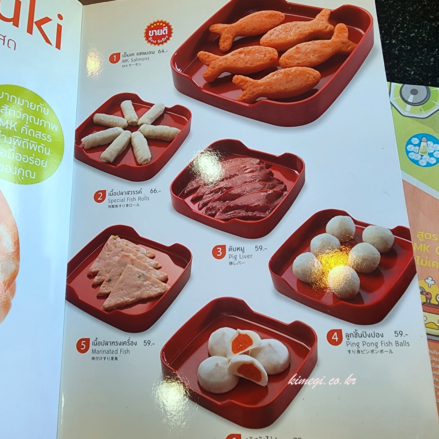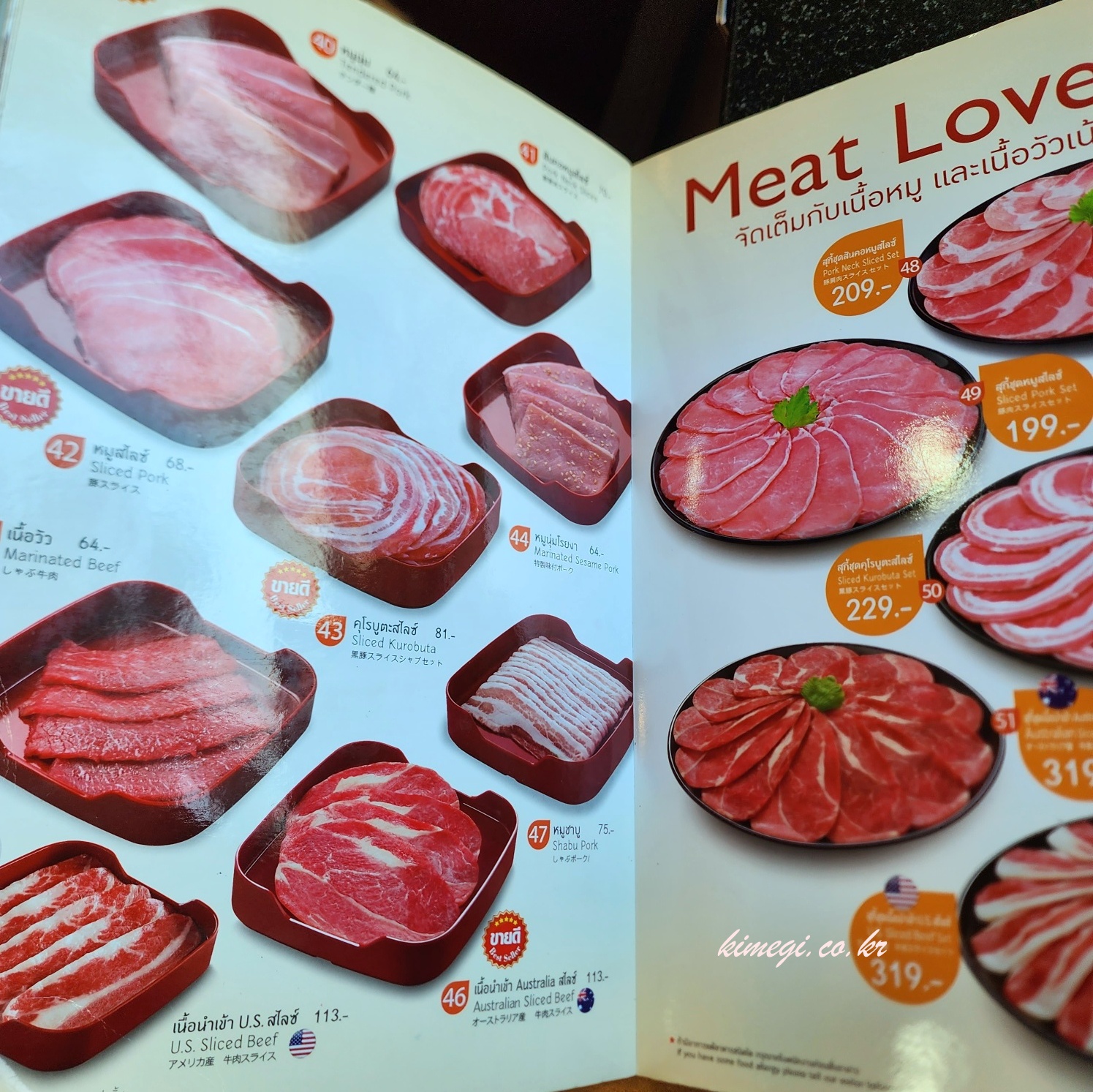 MK레스토랑에서는 태국 샤부샤부 수끼를 판매합니다. 메뉴판에 주문할 수 있는 메뉴가 진짜 많아서 고르기가 힘들었습니다. 그래서 결국 세트로 되어 있는 것을 고르게 되더라고요. 야채와 해산물 세트를 고르고 고기는 그냥 보이는 데로 주문했습니다.