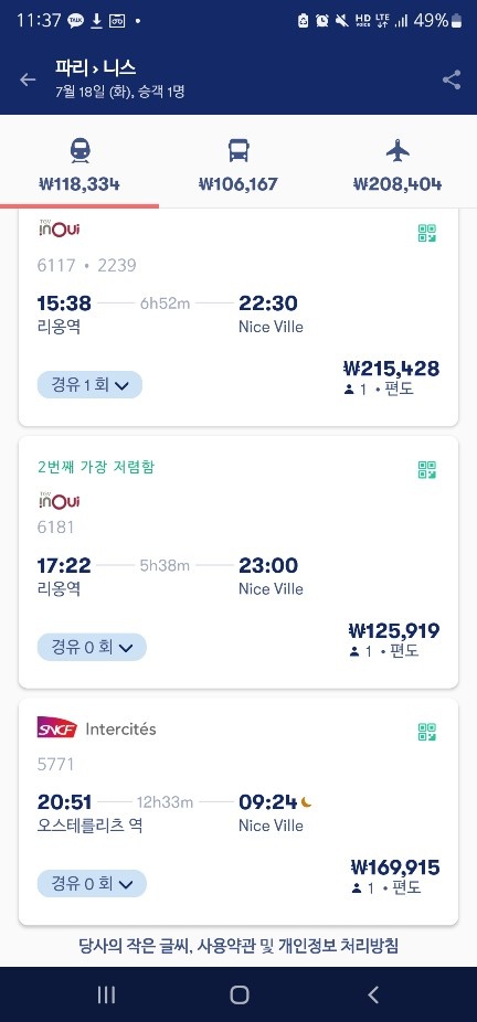 예약하는 방법은 아주 간단합니다. 출발역은 파리, 도착역은 니스로 선택하고 원하는 날짜를 입력하면 해당 일에 배정되어 있는 교통수단이 떠요. 기차뿐만 아니라 버스, 비행기도 있어서 운행 시간과 가격을 비교해서 예약을 할 수 있어요.