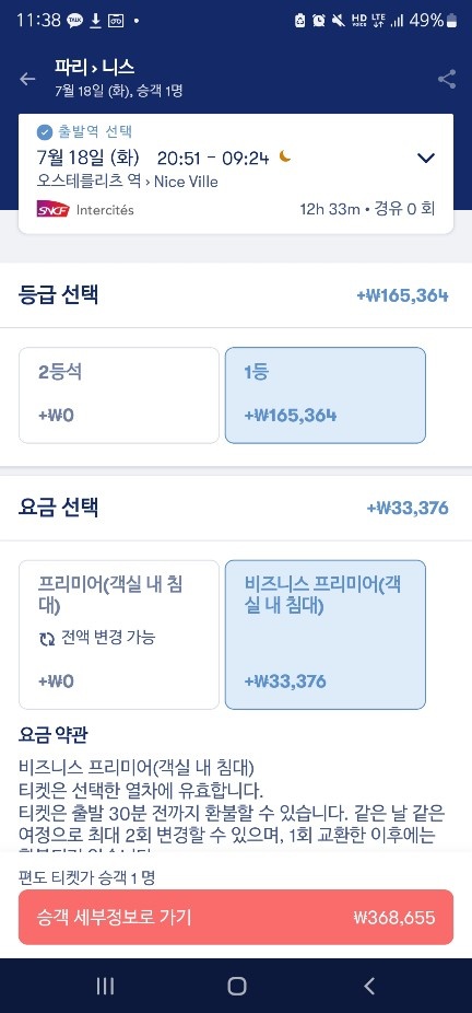 2. 파리 오스테를리츠역에서 니스역행 야간열차 선택