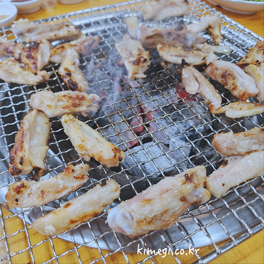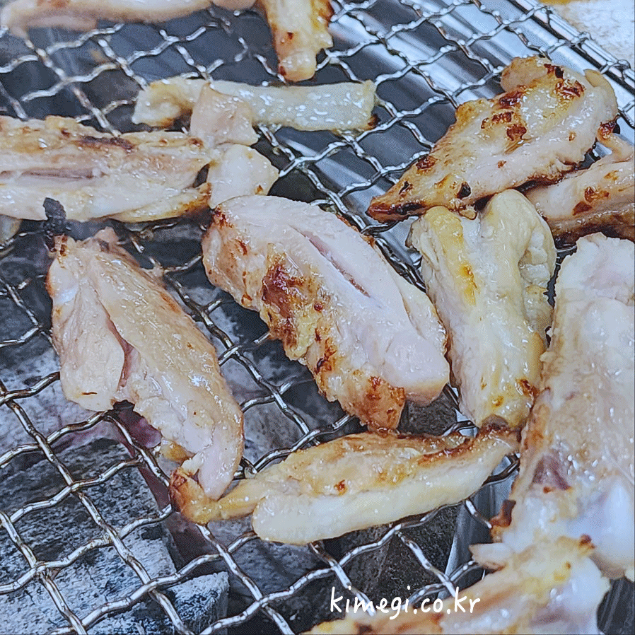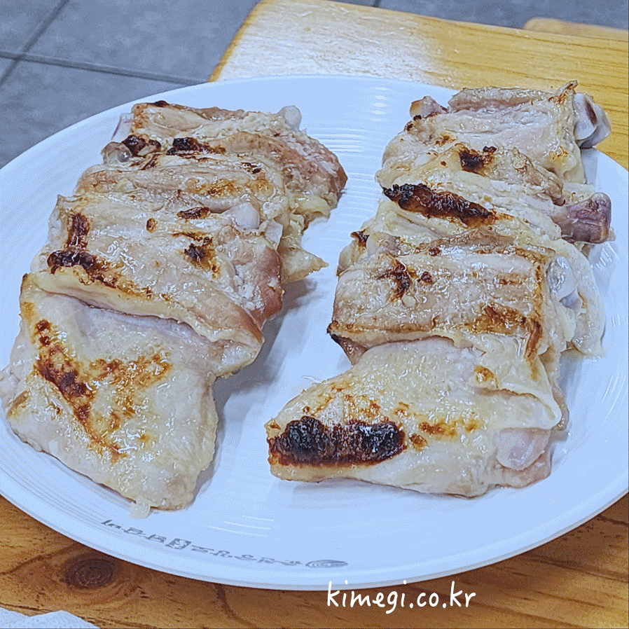 뼈를 잘 발라주고 맛있게 구워주면 됩니다. 개인적으로는 참맛 닭다리살이 훨씬 맛있는 것 같아요. 각종 소스에 찍어먹을 수 있는데 역시 고기는 소금에 찍어 먹는 것이 정말 맛있습니다. 진짜 야들야들하고 부드러운 닭갉비 구이입니다.