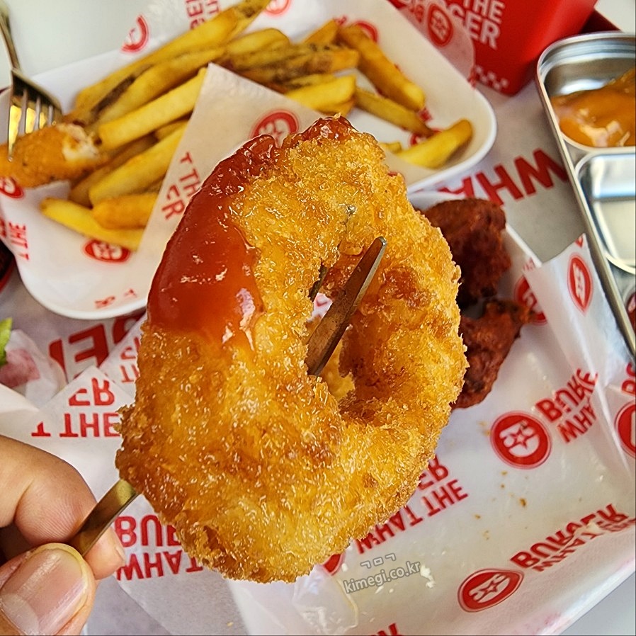 새우링은 오징어링처럼 생겼는데 안에 맛있는 새우가 들어있어요. 새우가 통통하니 케첩에 찍어 먹으니까 너무 맛있더라고요. 사이드를 꼭 하나 주문하라면 새우링을 추천합니다.