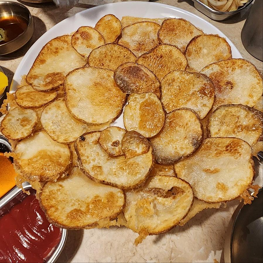 알 감자전은 처음보는 스타일이였어요. 그냥 감자를 얇게 썰어서 구운거라 다 아는 맛있데 곤이의 매콤함을 잡아주는 아주 좋은 안주였어요.